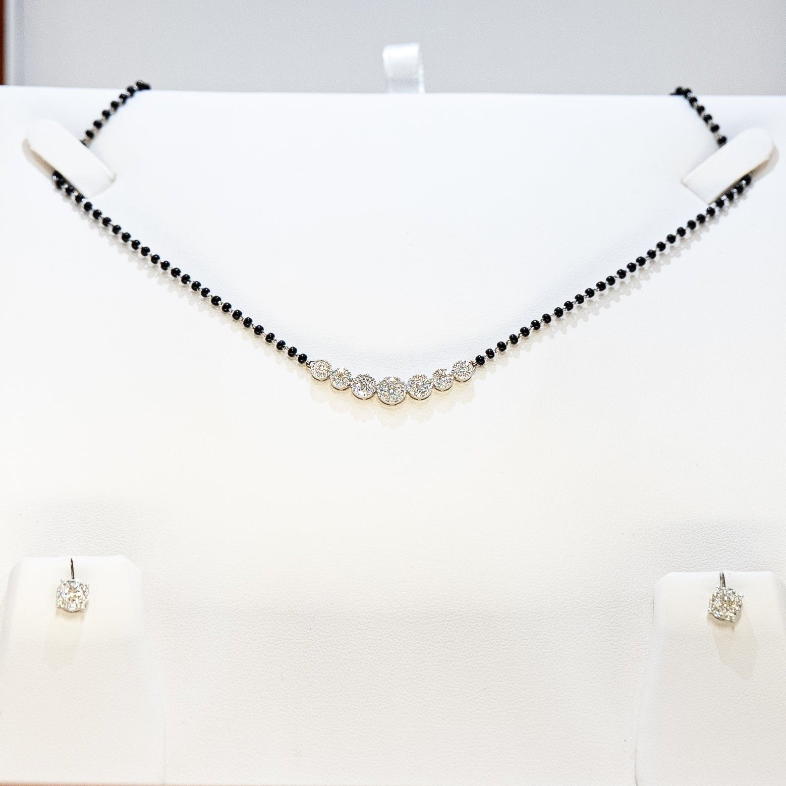A contemporary 18ct white gold mangal sutra featuring a row of brilliant diamonds totalling 1.27ct, paired with traditional black beads. The mix of modern white gold styling and classic cultural detailing makes it perfect for weddings. Complete set with diamond stud earrings.