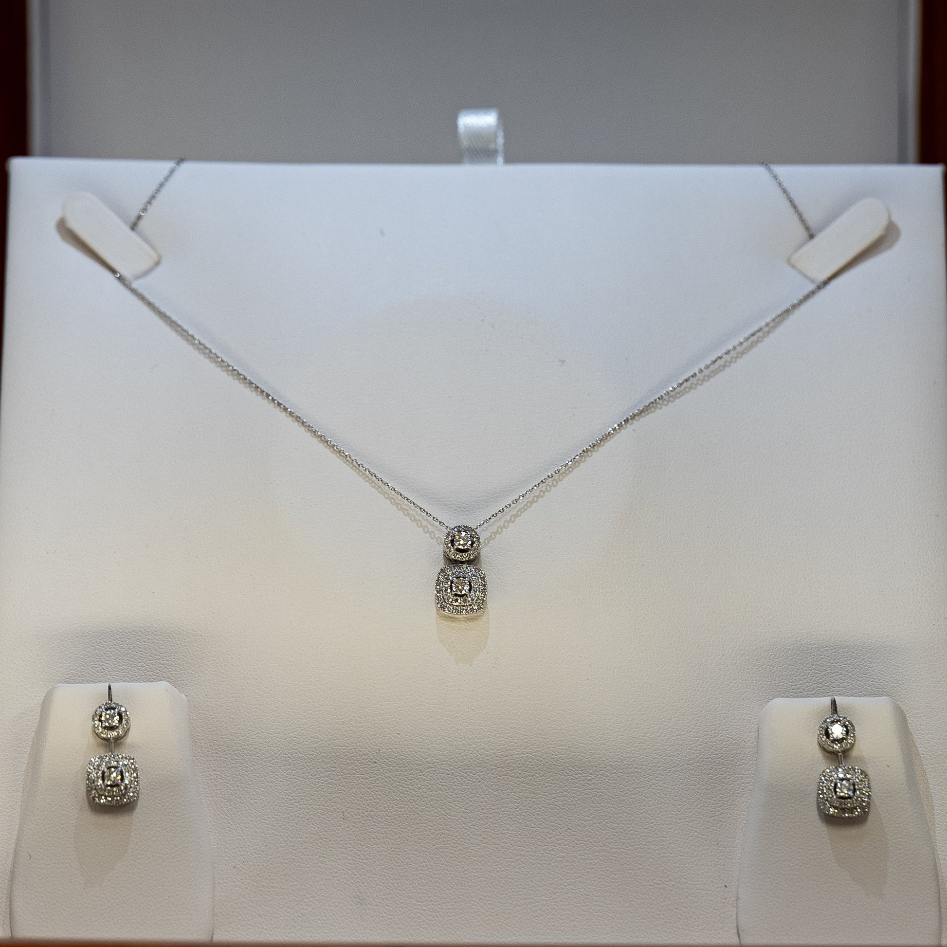 A striking 18ct white gold set featuring a double halo pendant and matching earrings with an approximate total of 2.5ct of diamonds. The layered halos create depth and high sparkle, making this set ideal for bridal wear, receptions and major celebrations.