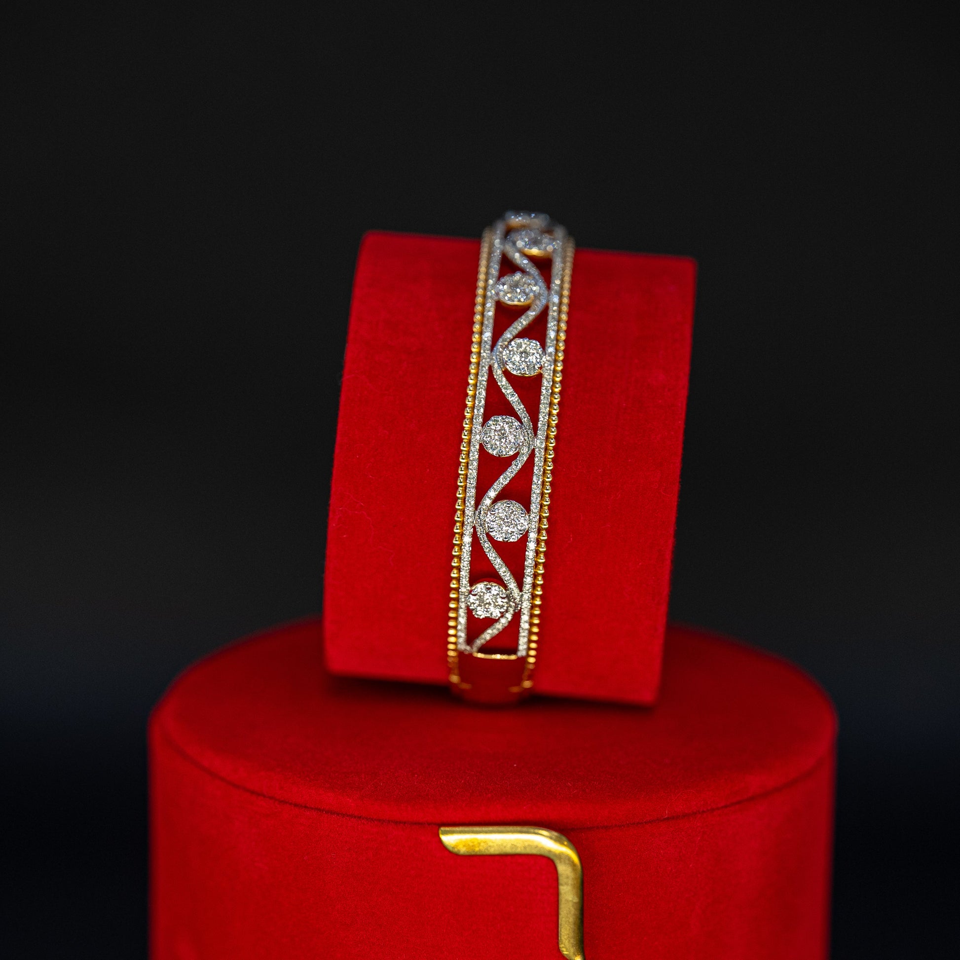 A statement 18ct yellow gold kada with an intricate cut out design set with 1.782ct of diamonds. The pattern blends traditional styling with a clean modern finish, making it ideal for festivals, family celebrations and bridal wear.