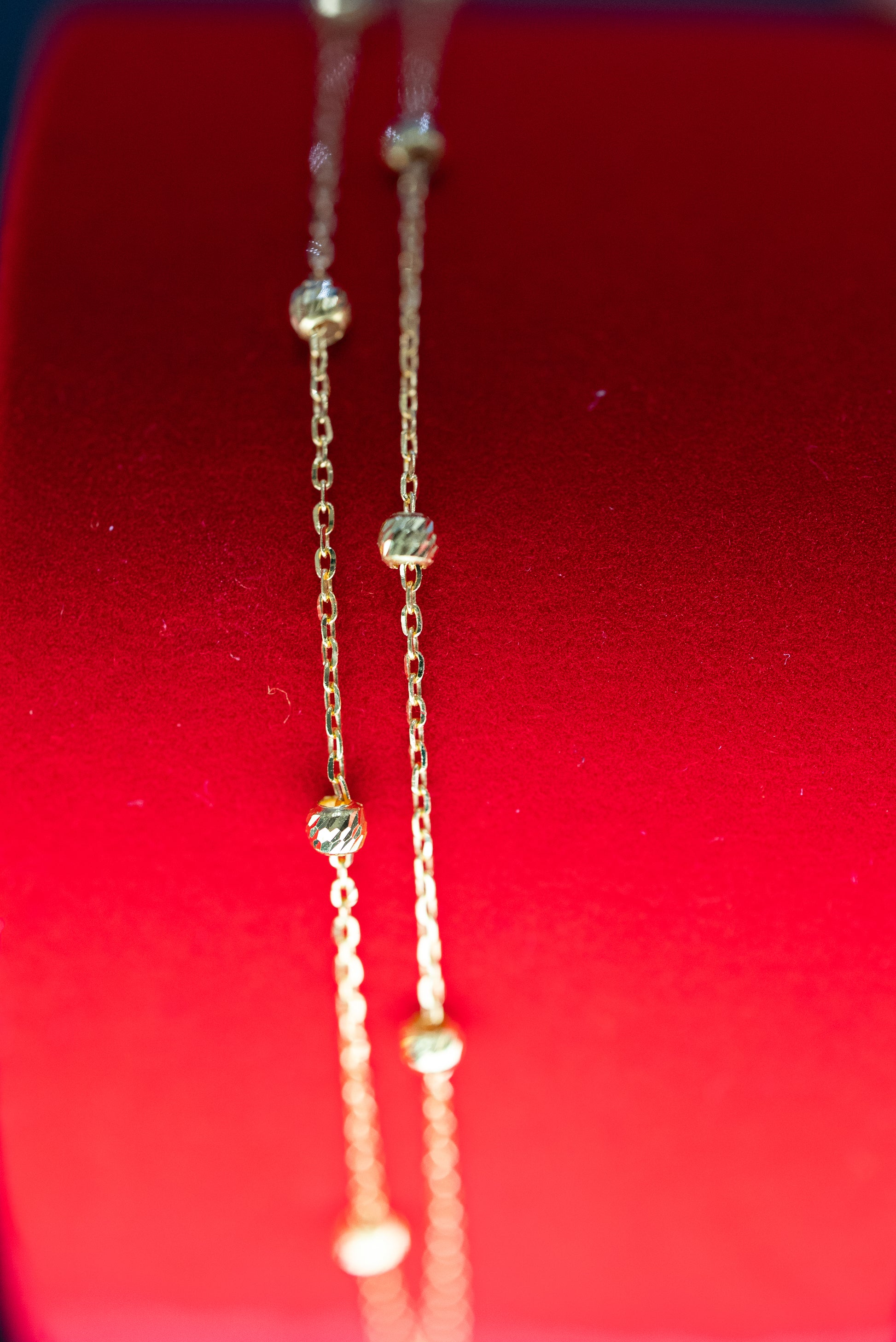This delicate 22ct gold double-chain bracelet features two fine gold chains accented with subtle polished gold stations, creating a light, elegant silhouette on the wrist. The layered chain design adds gentle movement and interest while maintaining a refined, understated finish.
