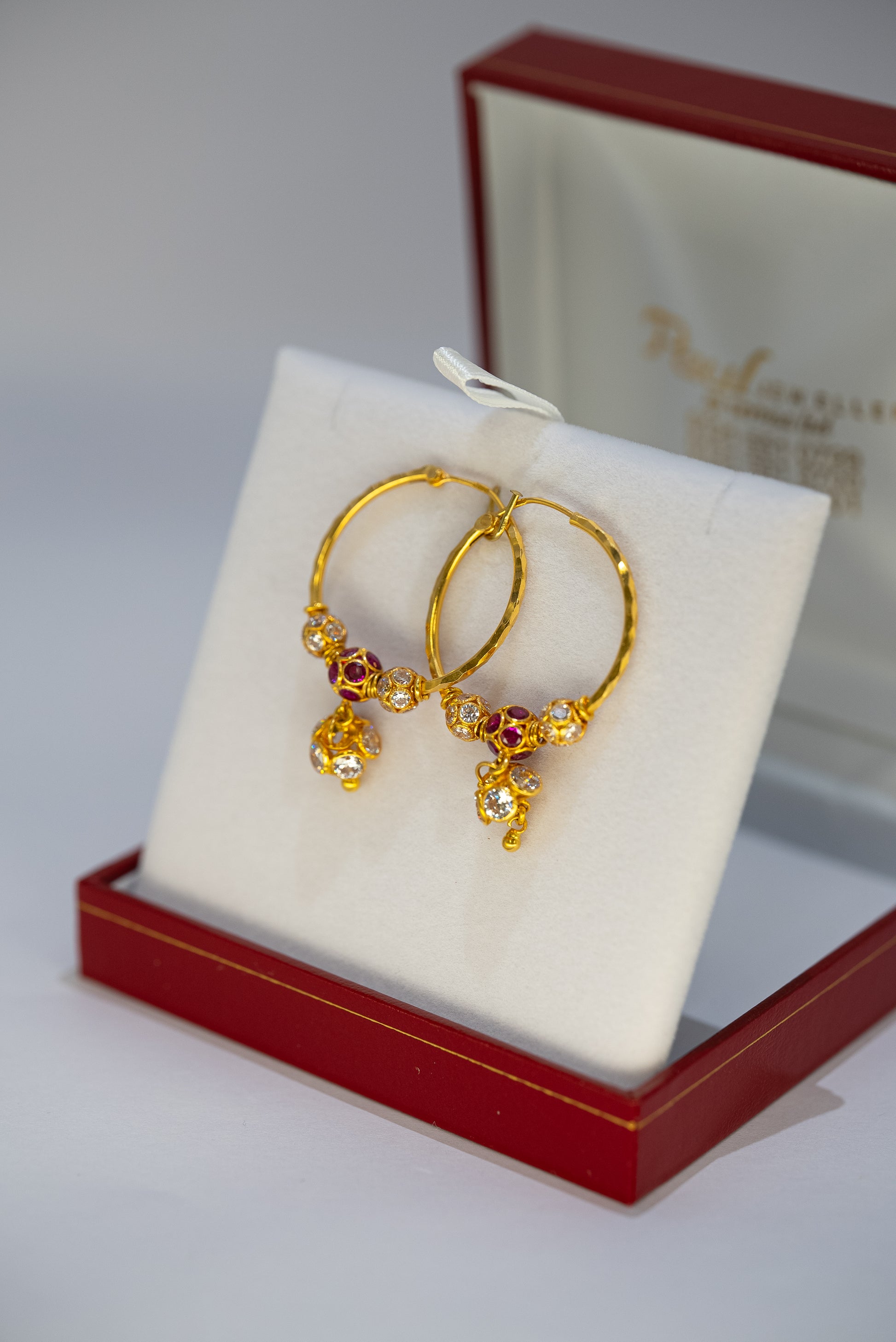 Elegant 22-carat gold hoop earrings featuring magenta and white CZ stones, accented with small hanging jhumki-style drops for added movement and sparkle. The textured hoop and detailed goldwork create a beautiful balance of traditional charm and modern elegance.