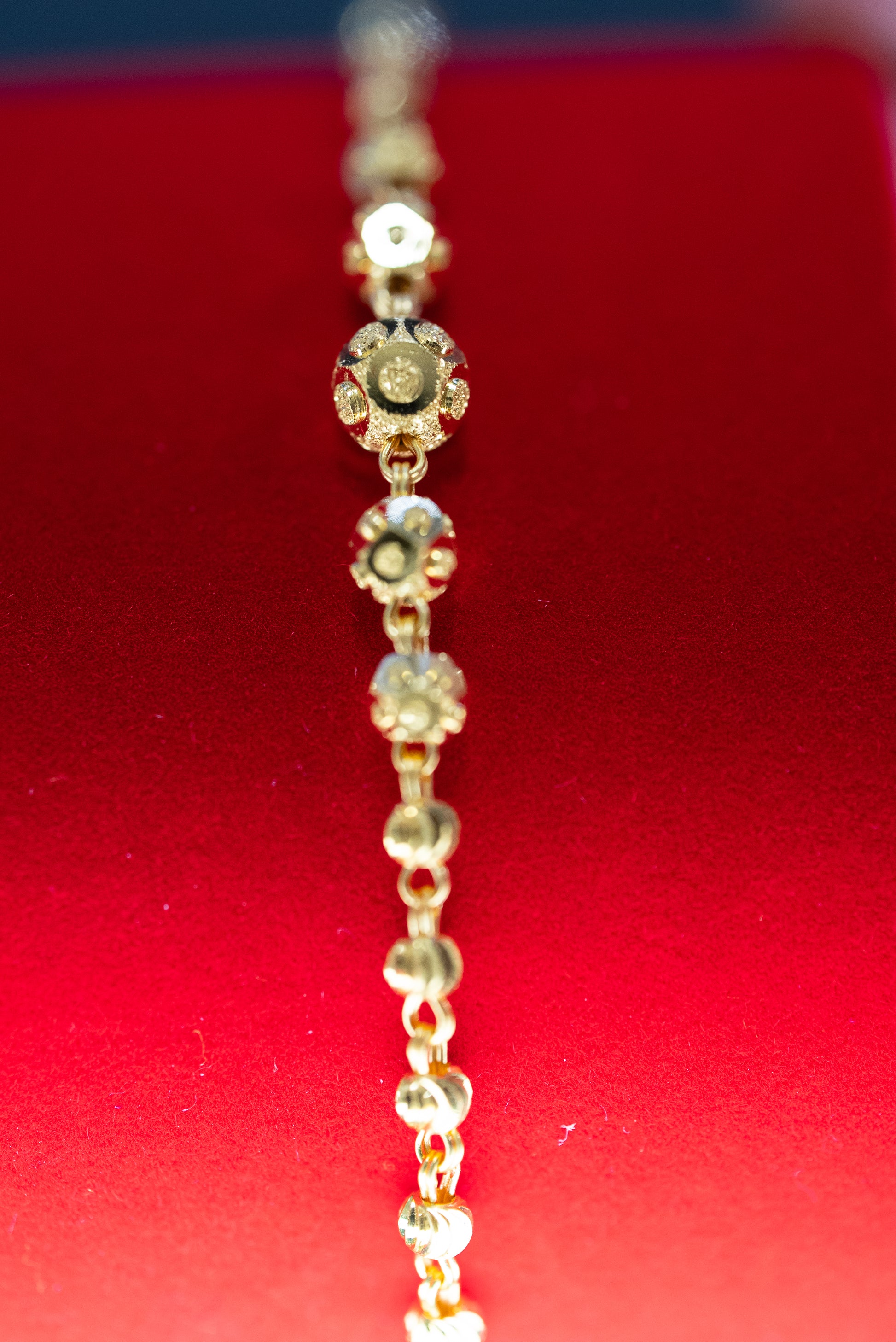 This elegant 22ct gold beaded bracelet is designed for everyday wear, offering a refined take on a traditional style. Crafted with evenly spaced polished gold beads, the bracelet has a delicate, fluid profile that sits comfortably on the wrist while maintaining a subtle presence.