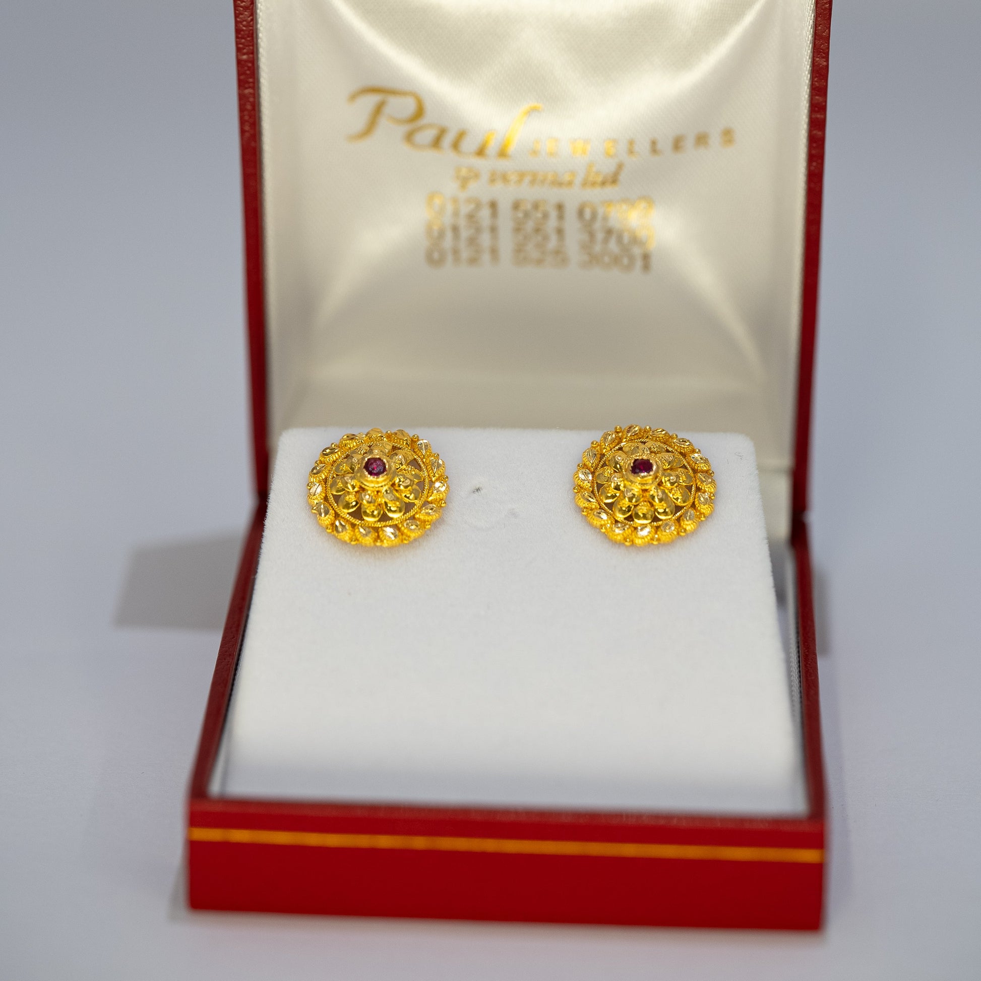 Elegant 22-carat gold stud earrings with a textured floral design and a red stone centrepiece. The engraved finish gives them a radiant sparkle, while the classic circular shape makes them perfect for everyday wear or traditional occasions.