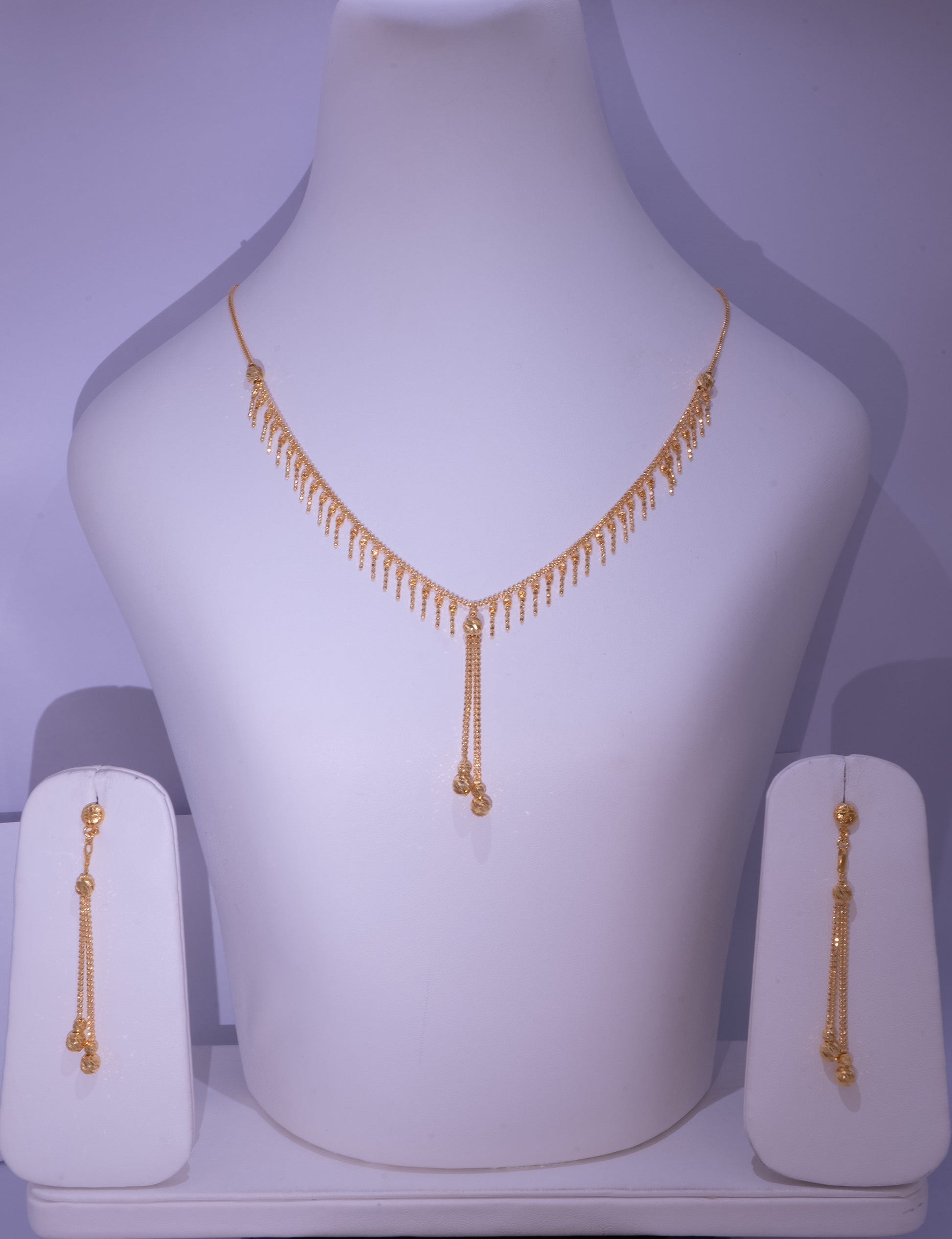 Delicate 22ct Gold Engagement Set with Drop-Down Beaded Chain and Matching Three Strand Chain Earrings.
