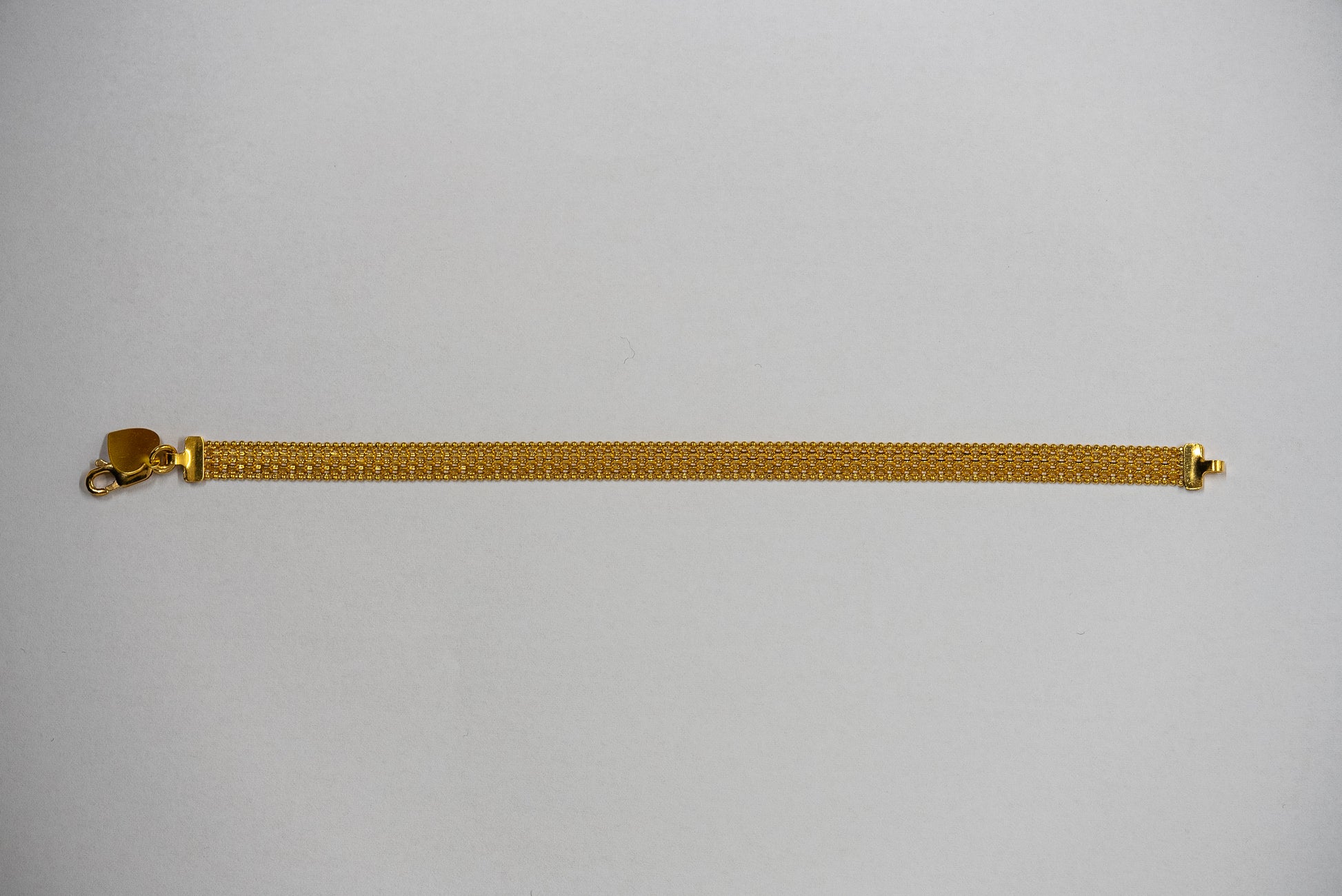 A sophisticated 22ct gold bracelet featuring a finely woven mesh design that showcases expert craftsmanship and a flawless finish. The intricate interlinking pattern gives the bracelet a smooth texture and graceful flexibility, making it both comfortable and striking. The polished clasp adds a clean finishing touch, creating a piece that balances traditional artistry with contemporary style.