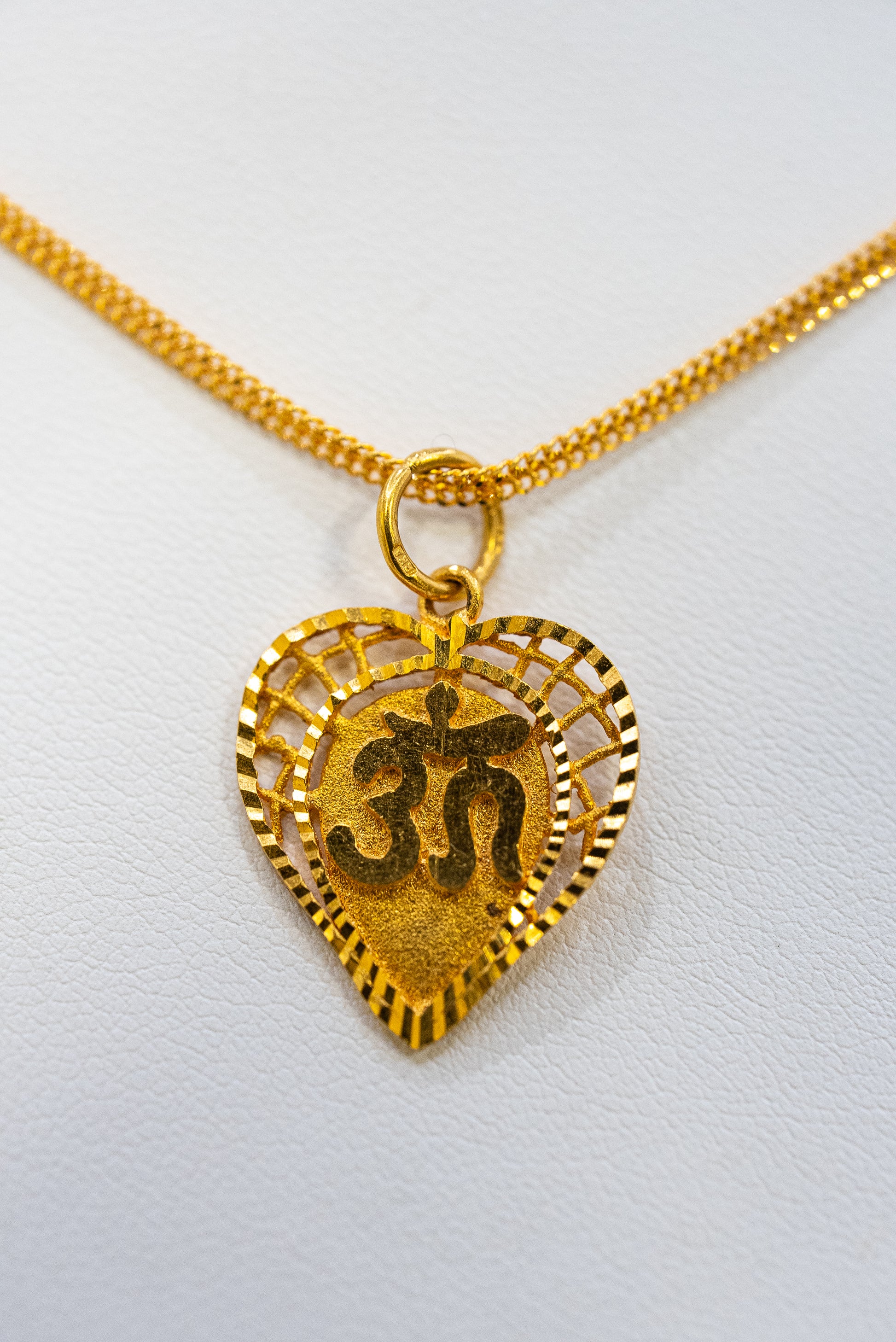 A beautiful 22ct Gold Om pendant crafted with elegance and devotion. The design features the sacred Om symbol at its center, set within a delicate heart-shaped frame with intricate cutwork detailing. The pendant’s polished gold surface captures the light gracefully, making it both a spiritual and stylish accessory. Perfect for daily wear or festive occasions such as Diwali, where symbols of peace and divinity are celebrated.
