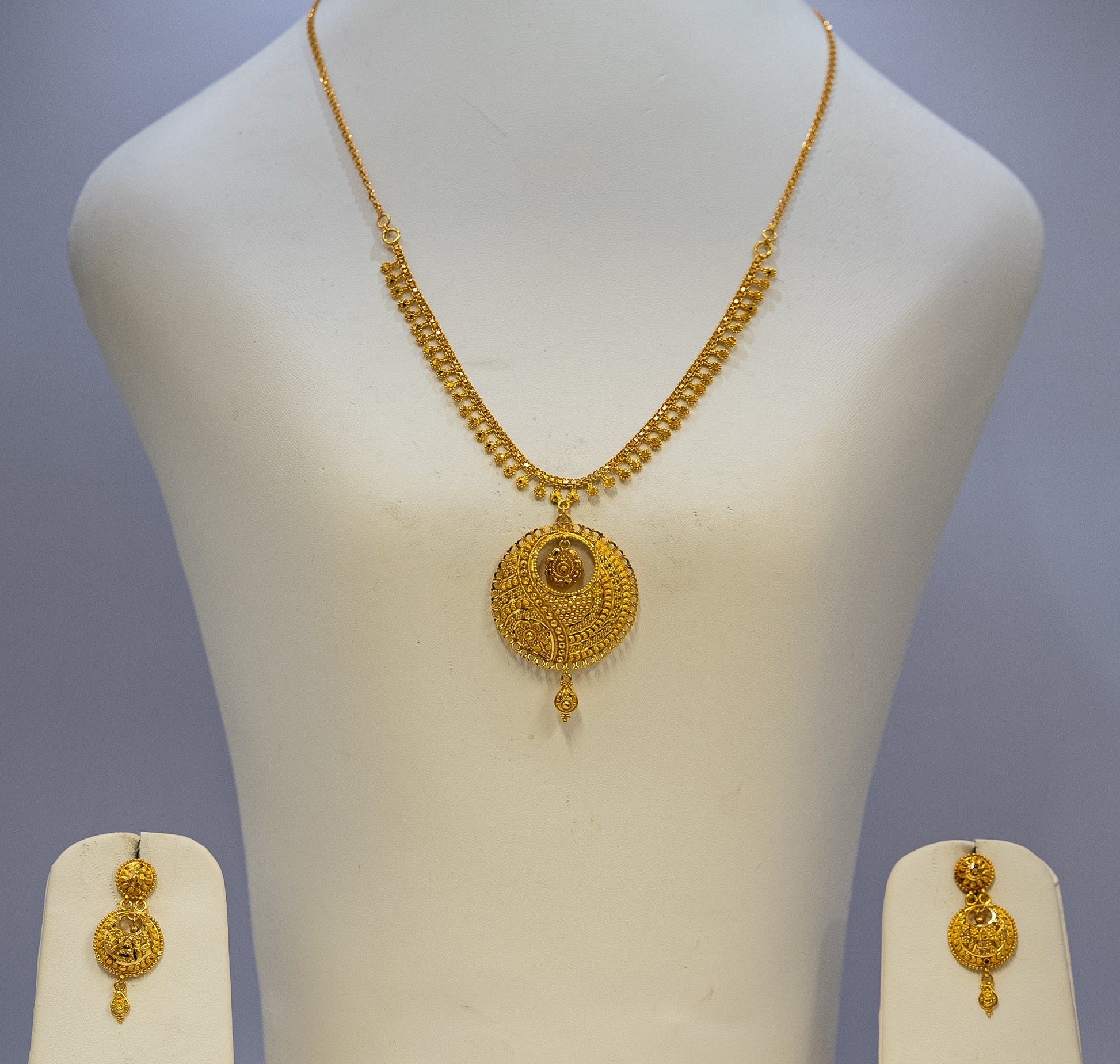 A striking 22ct Gold necklace and earring set featuring a bold circular sunburst pendant and matching earrings. The necklace’s detailed chain is adorned with delicate gold beadwork that leads to the statement pendant, a meticulously engraved concentric design with a central dome and drop finial that embodies radiance and grace. The matching earrings mirror this motif, completing a balanced and traditional look.