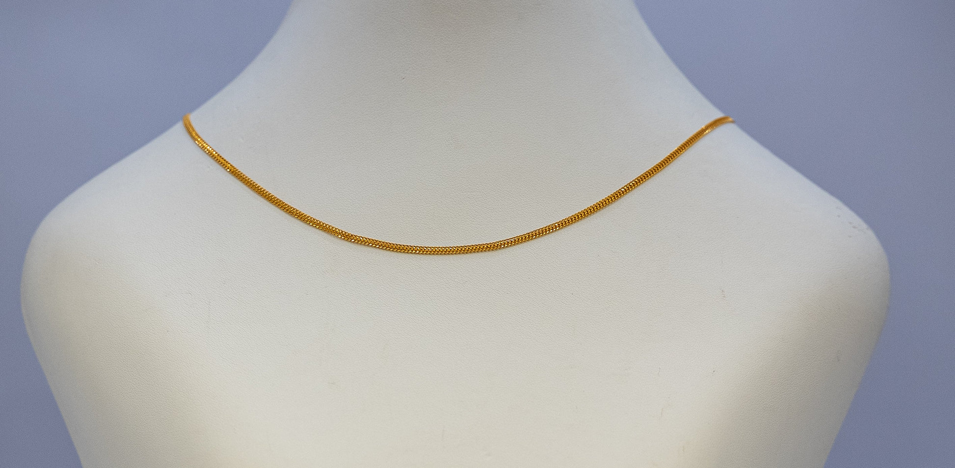 A sleek 22ct gold short snake chain designed with precision and a flawless smooth finish. The closely linked structure gives it a flexible, fluid form that sits elegantly along the neckline. Its high-polish surface enhances the rich tone of pure gold, creating a refined and versatile piece that pairs effortlessly with pendants or stands beautifully on its own.