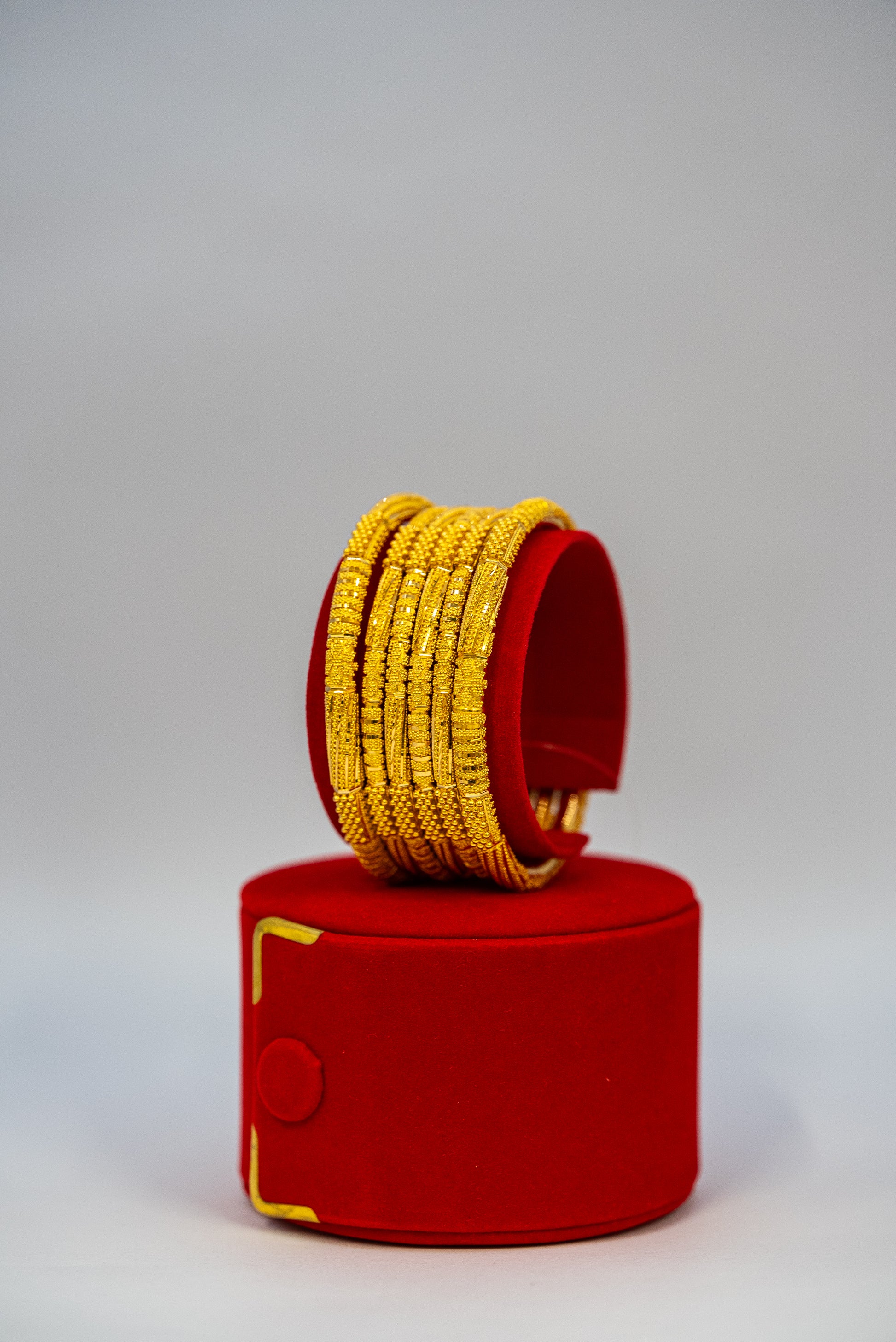 A stunning 22ct gold bangle set crafted with exceptional attention to detail. Each bangle features intricate texturing and fine beadwork, combining traditional design with a modern, polished finish. The multiple bangles create a rich, layered look that moves gracefully with the wrist, catching light from every angle. Elegant and timeless, this set reflects the beauty of handcrafted gold jewellery.