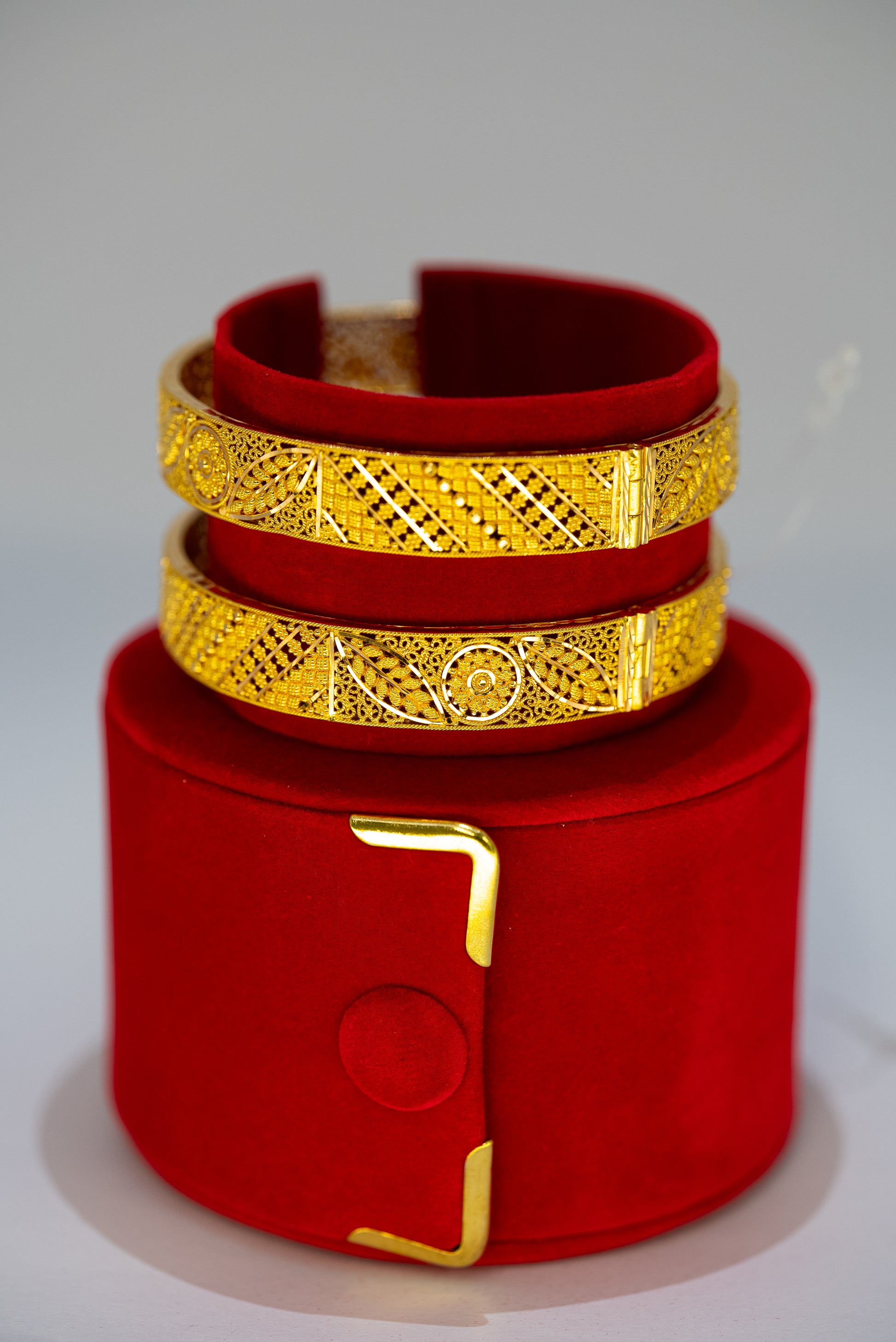 A refined pair of 22ct gold karas featuring intricate hand-engraved geometric and floral motifs that reflect the richness of traditional Indian goldwork. The detailed craftsmanship and radiant finish make these a timeless choice for festive wear or formal occasions.